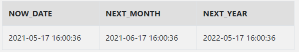 , TO_CHAR(ADD_MONTHS(TO_DATE('31-MAY-21'), 1), 'YYYY-MM-DD HH24:MI:SS') AS NEXT_MONTH_DATE1