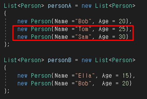 객체 personA 기준으로 Except() 메서드를 호출하면 동일한 요소를 제외하고 다음 두 개의 요소가 반환되어야 합니다.
