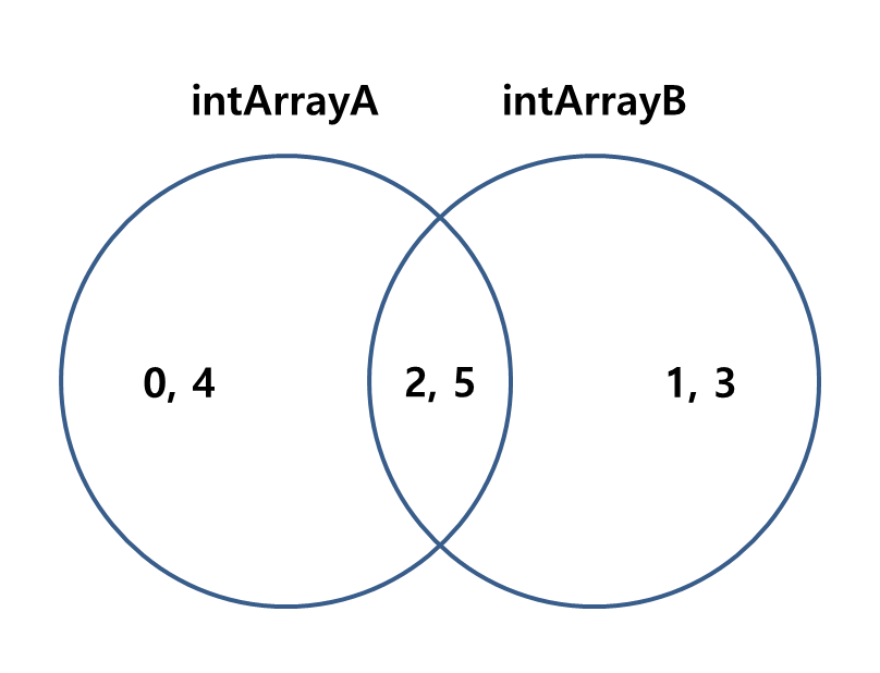 int 타입의 배열인 intArrayA와 intArrayB가 존재합니다. intArrayA와 intArrayB에 모두 존재하는 요소는 2, 5입니다.