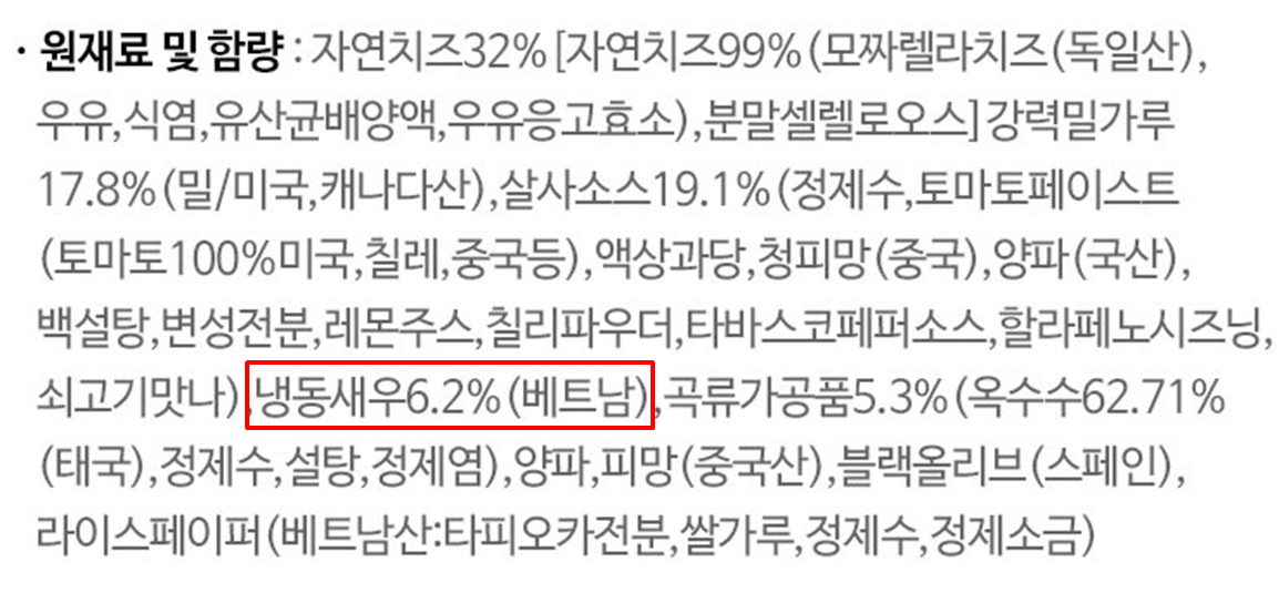 고기가 없어서 그런지 불고기피자보다 5g 많은데도 76kcal가 낮다. 참고로 새우는 베트남산이다.