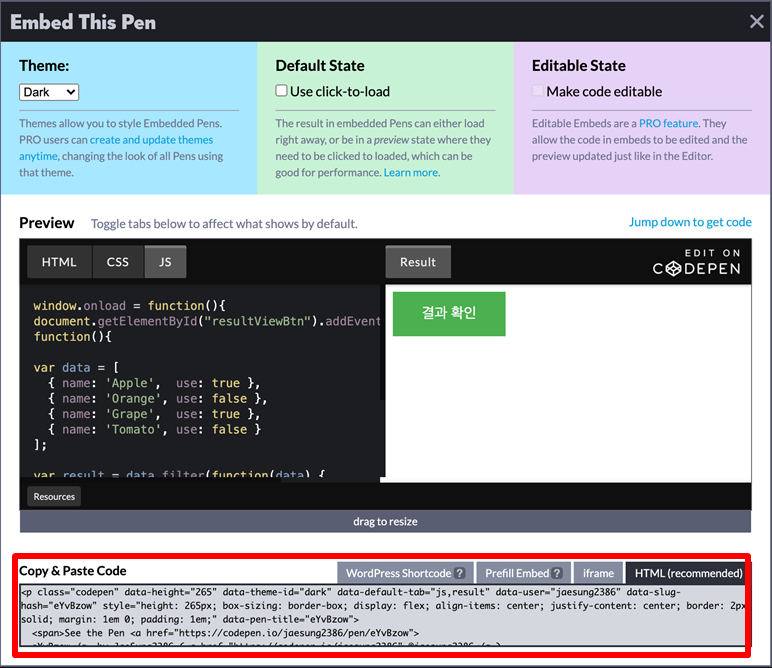 6. Embed 버튼을 클릭 후 코드를 복사합니다.