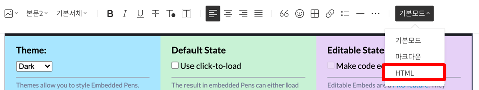 7. 티스토리에서 HTML모드로 들어갑니다.