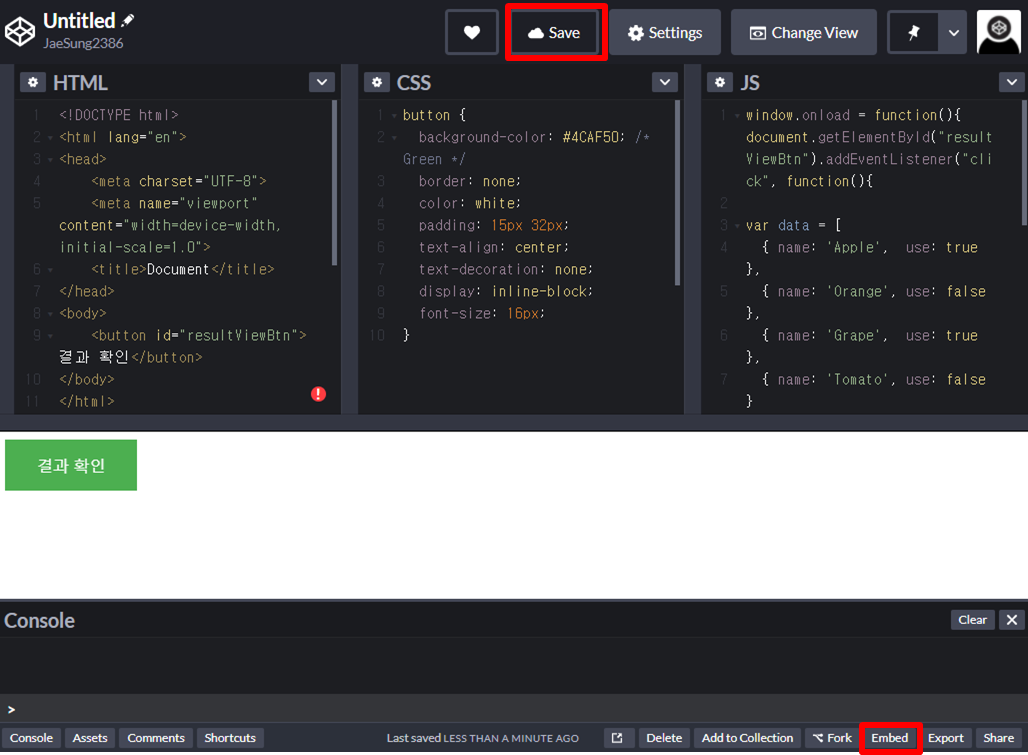 5. Save버튼을 클릭 후 우측 하단의 Embed 버튼을 클릭합니다.