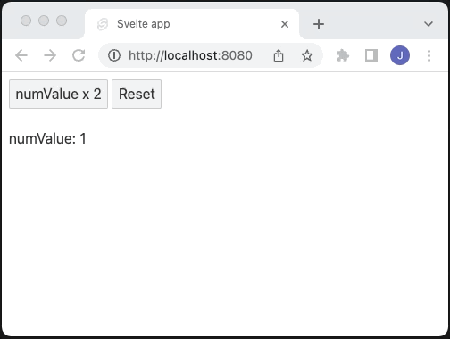 App.svelte 컴포넌트는 스토어 numValue를 구독합니다. "numValue x 2" 버튼을 클릭하면 update() 함수를 호출하여 numValue 스토어의 값을 2배로 증가시키며, "Reset" 버튼을 클릭하면 set() 함수를 호출하여 numValue 스토어의 값을 1로 초기화합니다.