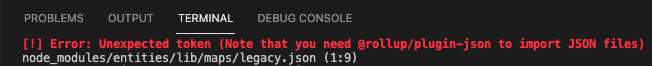 Svelte (rollup) - Error: Unexpected token (Note that you need @rollup/plugin-json to import JSON files)