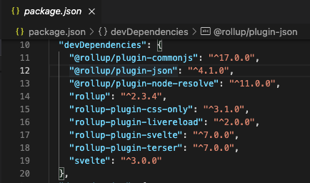 package.json 파일에서 @rollup/plugin-json 라이브러리가 정상적으로 설치되었는지 확인합시다.