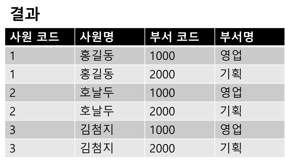 사원 코드 : 3, 사원명: 김첨지, 부서 코드: 1000, 부서명: 영업