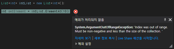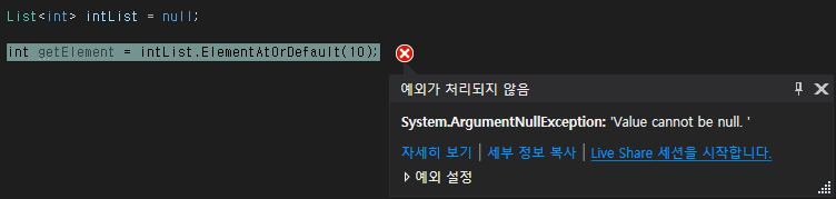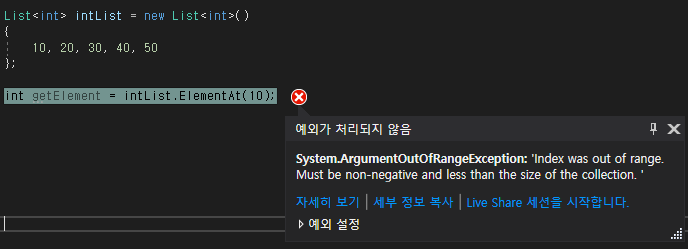 ElementAt() 메서드의 인자에 전달된 값이 데이터 집합의 범위를 벗어나는 경우에는 ArgumentOutOfRangeException 예외가 발생합니다.