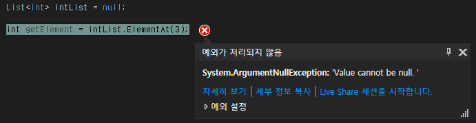 ElementAt() 메서드를 호출하는 데이터 집합이 null로 초기화되거나 ElementAt() 메서드의 인자로 전달된 인덱스 값이 데이터 집합의 범위를 벗어나면 런타임 에러가 발생합니다.
