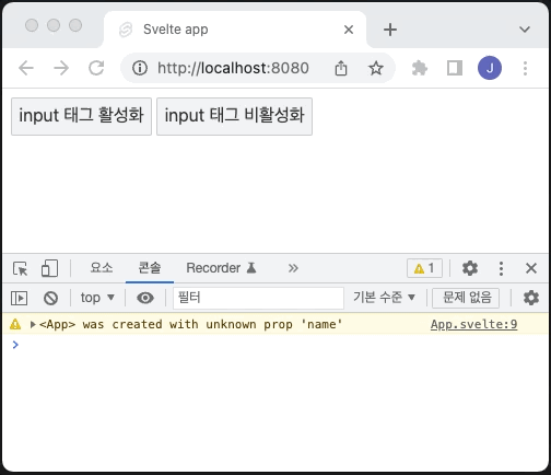 예를 들어, 다음과 같이 "input 태그 활성화" 버튼을 클릭하면 조건문에 의해 input 태그가 활성화됩니다. input 태그 활성화됨과 동시에 input 태그와 바인딩된 변수를 사용하여 포커싱 처리하려고 했으나 TypeError가 발생합니다.