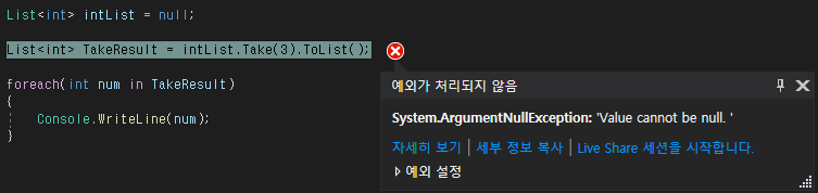 만약, Take() 메서드를 호출하는 데이터 집합이 null인 경우 ArgumentNullException이 발생합니다.