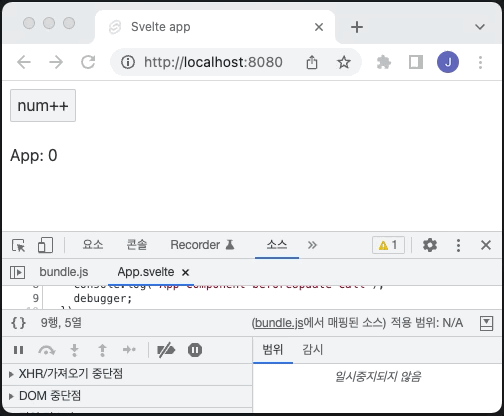 디버그 상태에서 numValue의 값이 DOM에 반영되지 않은 것을 확인할 수 있으며, 코드를 계속 실행 후 변경된 numValue의 값이 DOM에 적용되었습니다.