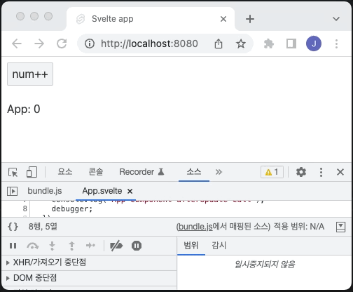 컴포넌트의 변경된 값이 DOM에 적용된 후 afterUpdate() 함수가 호출되는지 자세하게 알아봅시다. 다음 소스 코드는 afterUpdate() 함수에서 debugger 키워드를 사용합니다.