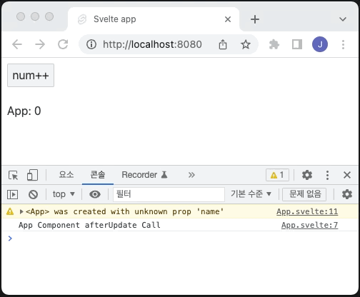 num++ 버튼 클릭 후 변수 numValue의 값이 1씩 증가할 때마다 변경된 numValue의 값을 웹 브라우저에서 확인할 수 있으며, 콘솔 창에서 afterUpdate() 함수에 작성된 문구가 출력됩니다.