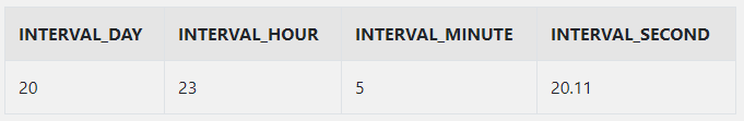 SELECT EXTRACT( DAY FROM INTERVAL '20 23:05:20.11' DAY TO SECOND ) AS INTERVAL_DAY
