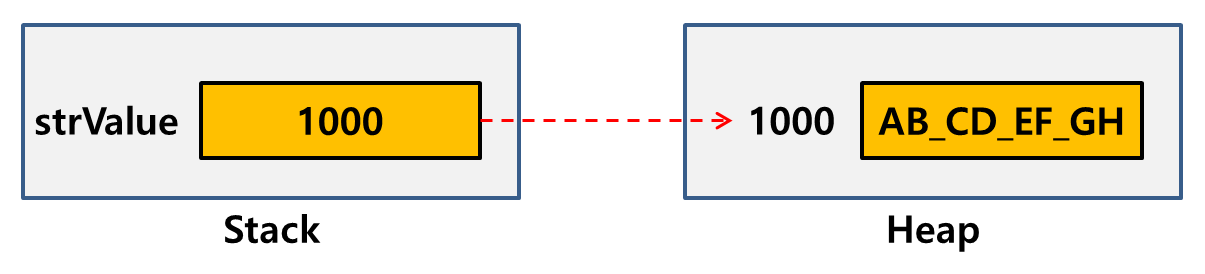 string 타입의 변수에 문자열을 할당하면, 문자열 변수는 Stack에 생성되지만 문자열 값은 Heap에 생성되기 때문입니다.