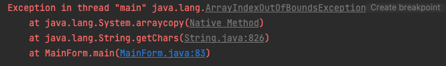 주의사항으로 문자 배열의 크기보다 할당되는 값이 많은 경우 ArrayIndexOutOfBoundsException이 발생합니다.