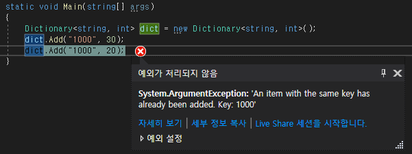 만약, 다음 예제처럼 Dicitionary의 키가 문자열 타입이고 중복되는 값을 키로 설정하는 경우 런타임 에러가 발생합니다.