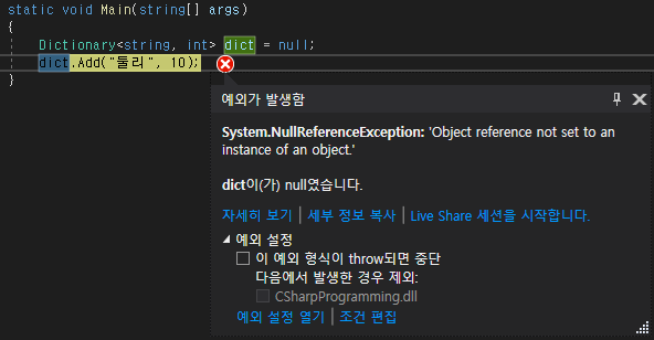 다음 예제는 null로 초기화된 Dictionary 객체에서 Dictionary 클래스에서 제공하는 Add() 메서드를 호출했을 때, 런타임 에러가 발생하는 것을 보여줍니다.
