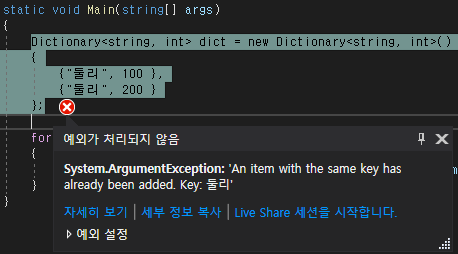 중괄호를 사용하여 중복되는 키를 할당하는 경우 ArgumentException이 발생합니다.