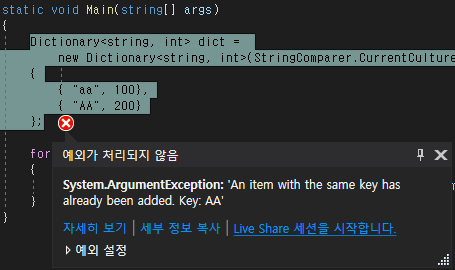 다음 예제는 문자열 비교자를 Dictionary 생성자 함수에 전달하며, 문자열 "aa"와 "AA"를 대소문자 구분하지 않고 비교하므로 ArgumentException이 발생합니다.