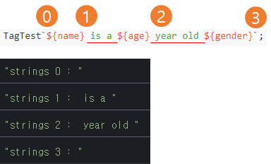 템플릿 문자열을 사용하면 앞에 태그를 추가할 수 있습니다. 태그는 ${ } 기준으로 분해된 문자열 값의 배열을 첫 번째 매개변수로 받습니다.