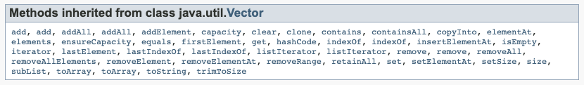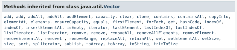 다음은 Stack 클래스에서 사용할 수 있는 Vector 클래스의 메서드 목록입니다.
