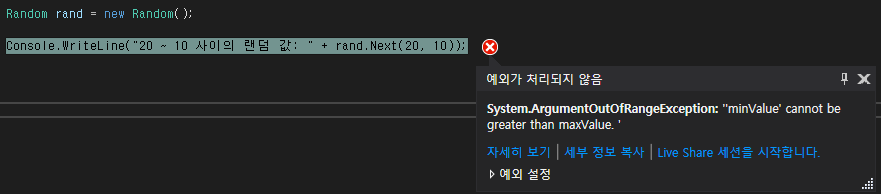 Console.WriteLine("20 ~ 10 사이의 랜덤 값: " + rand.Next(20, 10));