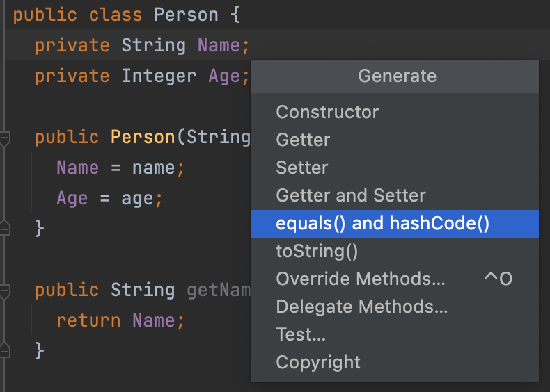 다음 예제는 IntelliJ에서 제공하는 기능을 사용하여 Person 클래스의 Name 필드를 비교하고 Name 필드를 기반으로 해시 코드를 생성하도록 equals() 메서드와 hashCode() 메서드를 재정의합니다.