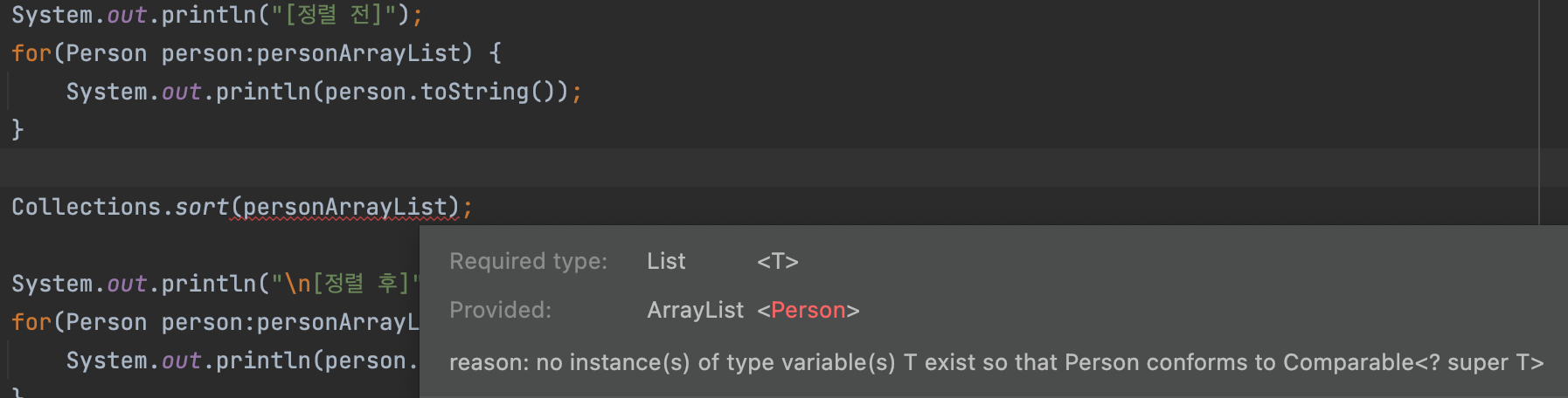 만약, Person 클래스가 Comparable 인터페이스를 구현하지 않는다면, Collections.sort() 메서드에서 컴파일 에러가 발생합니다.