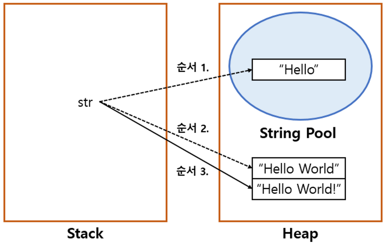 순서 3. += 연산자를 사용하여 문자열 변수 str에 문자열 "!"를 추가합니다. 두 번째 순서와 마찬가지로 String Pool 외부 영역에 새로운 문자열 "Hello World!"이 저장됩니다.