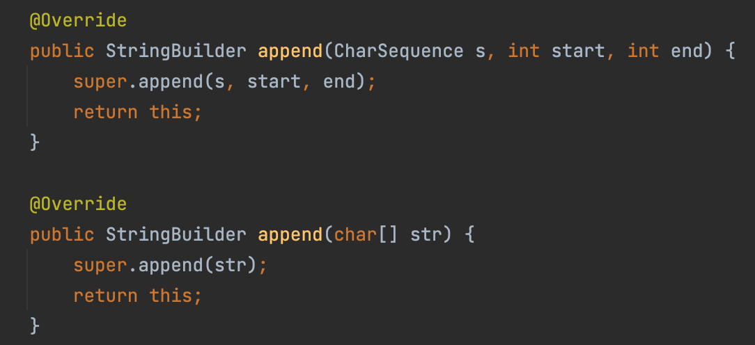 반면, StringBuilder 클래스에서 제공하는 메서드는 synchronized 키워드가 존재하지 않습니다.