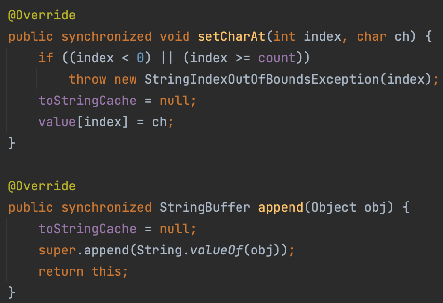 StringBuffer 클래스의 내부를 살펴보면, synchronized 키워드를 사용하여 메서드를 선언합니다.