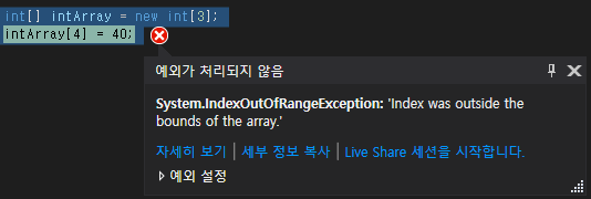 따라서, 배열의 크기를 벗어난 인덱스에 접근하는 경우 다음 예시처럼 IndexOutOfRangeException이 발생합니다.
