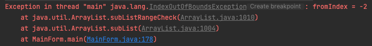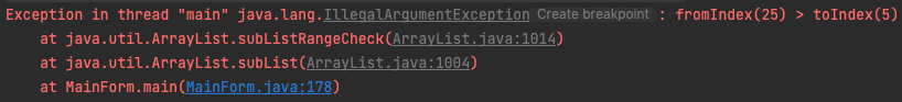 다음 예제는 subList() 메서드의 매개변수로 전달된 시작 위치가 마지막 위치보다 큰 경우입니다.