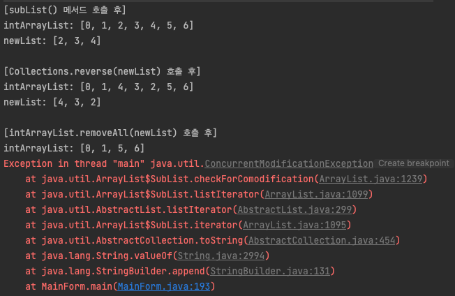에러가 발생하기 전에 실행 결과를 살펴봅시다. Collections.reverse() 메서드를 호출하여 newList의 값을 뒤집으면, intArrayList의 2번째 인덱스부터 5번째 인덱스까지 요소가 뒤집어진 것을 확인할 수 있습니다.