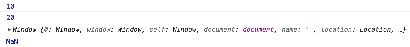 따라서, sum() 메서드 본문의 this.a는 window.a와 동일하고 this.b는 window.b와 동일합니다. 그리고 window 객체에 a와 b라는 프로퍼티가 존재하지 않으므로 this.a + this.b의 결과로 NaN이 반환됩니다.