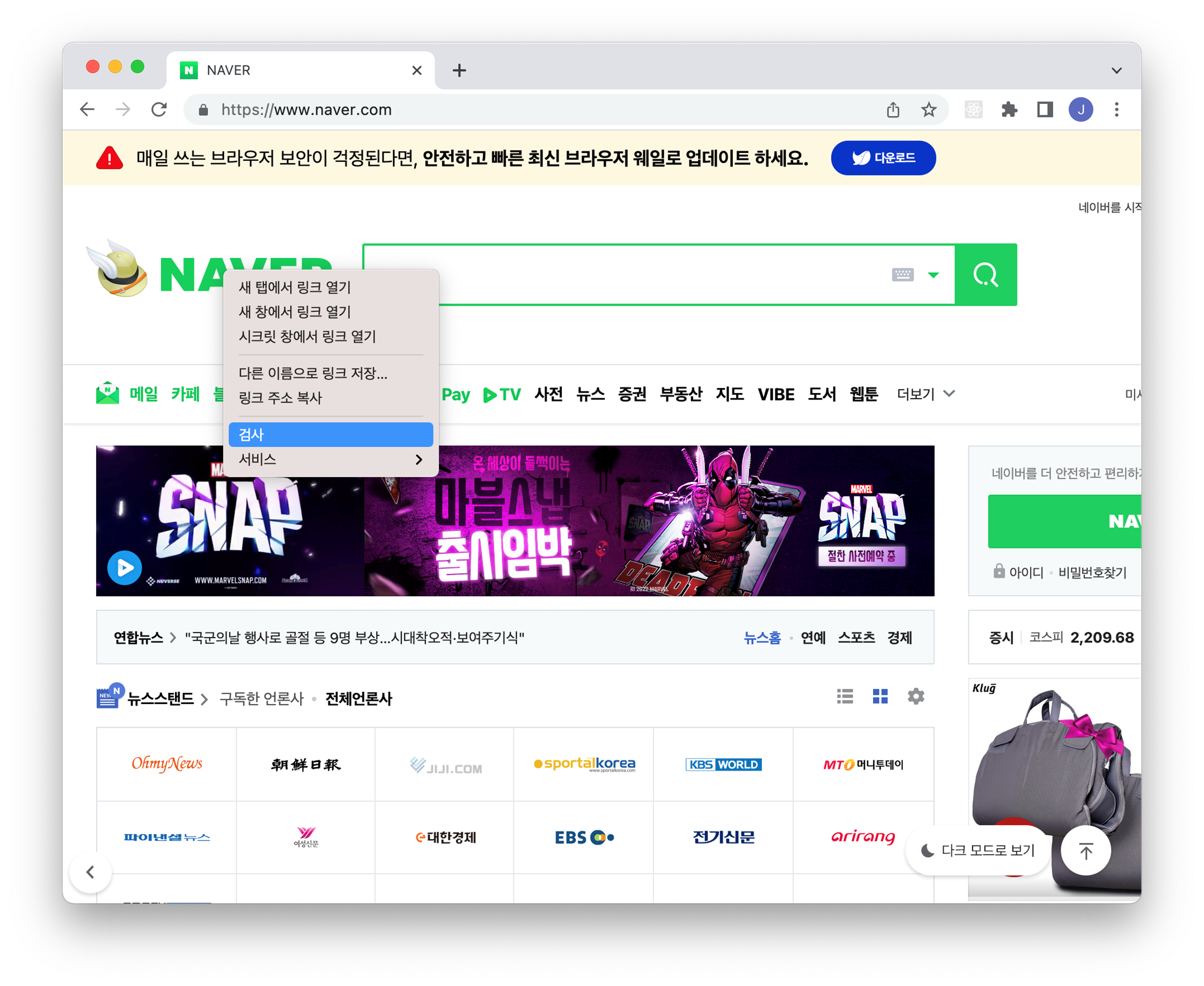 첫 번째 방법으로 마우스 우클릭으로 크롬 개발자 도구를 실행할 수 있습니다.