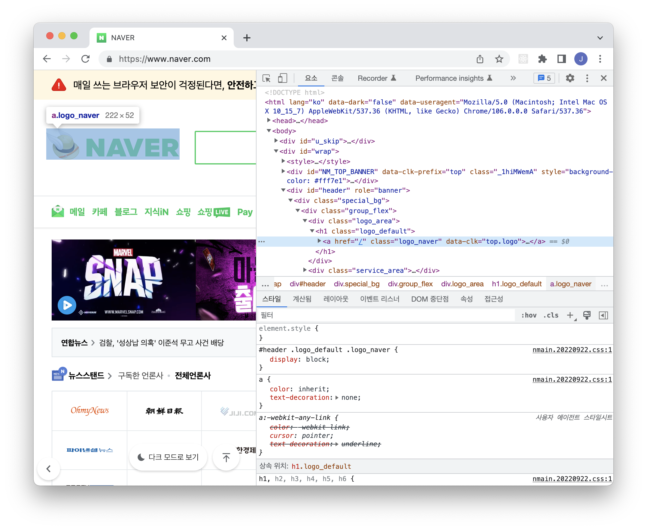 예를 들어, Naver 메인 사이트에서 로고의 스타일 또는 속성을 확인하려면, 다음과 같이 크롬 개발자 도구를 실행할 수 있습니다.