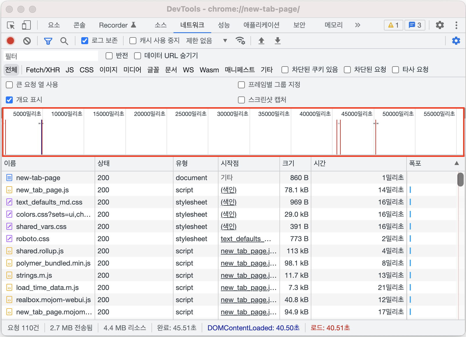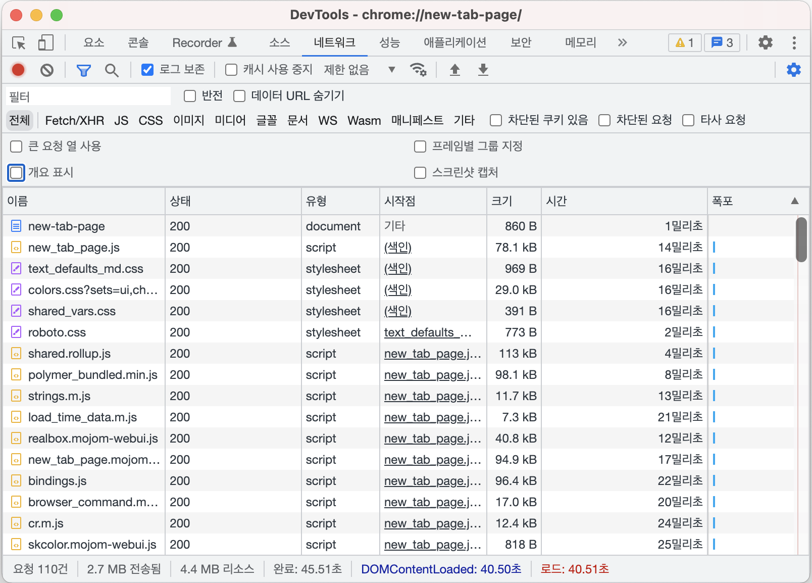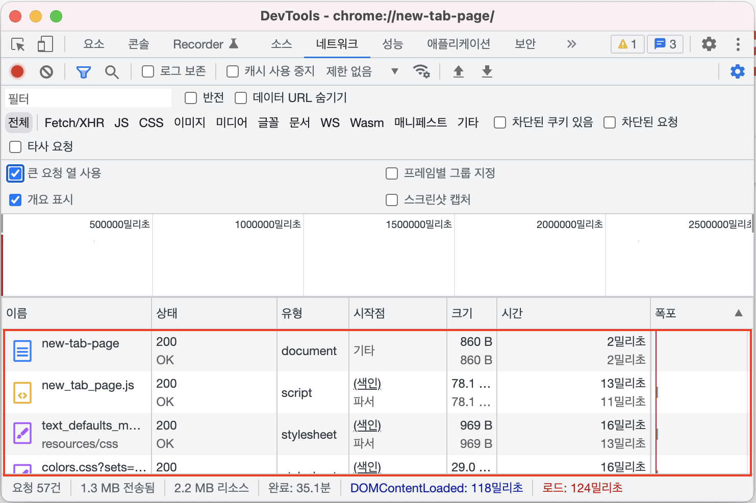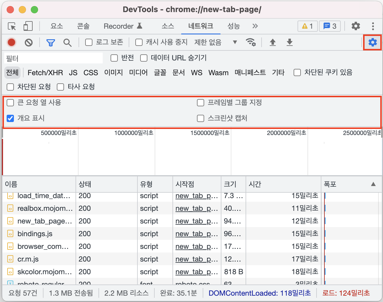 크롬 개발자 도구의 네트워크 탭은 기본적으로 개요 표시가 체크되어 있습니다.