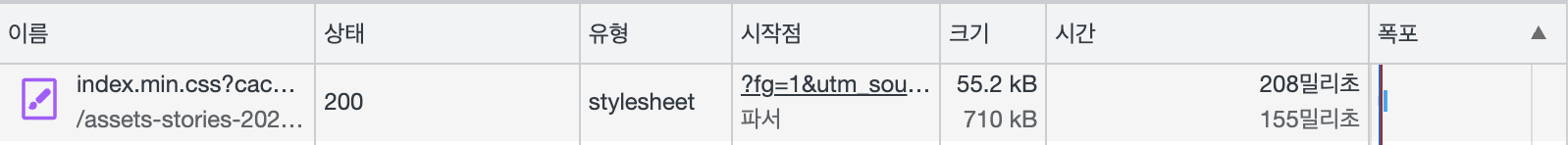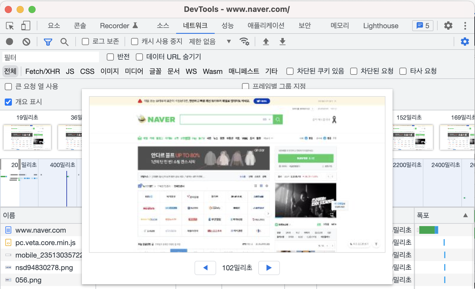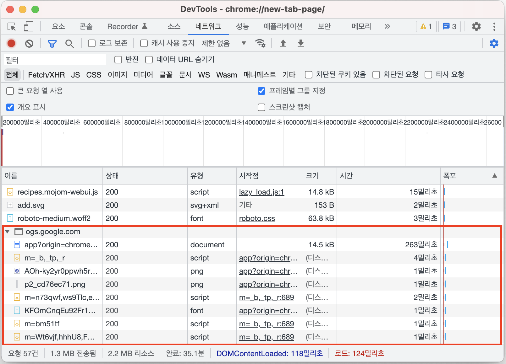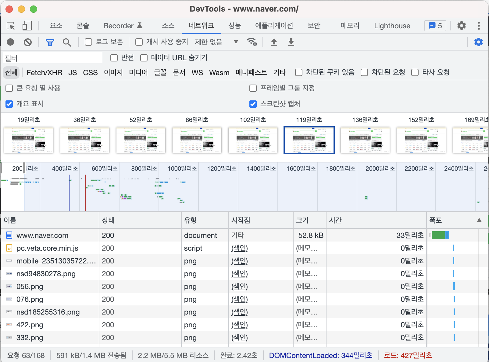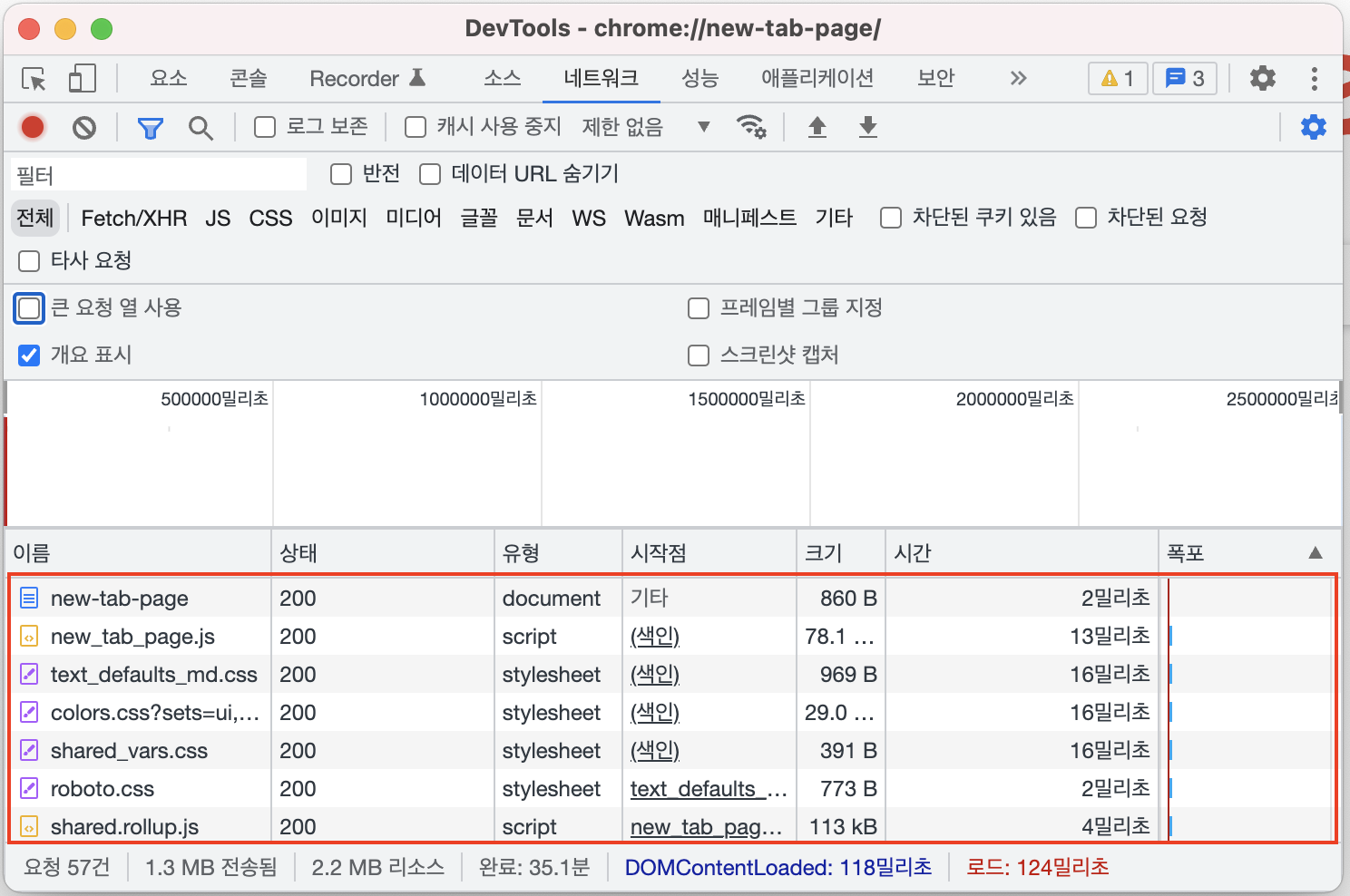 크롬 개발자 도구의 네트워크 탭은 기본적으로 개요 표시가 체크되어 있습니다.