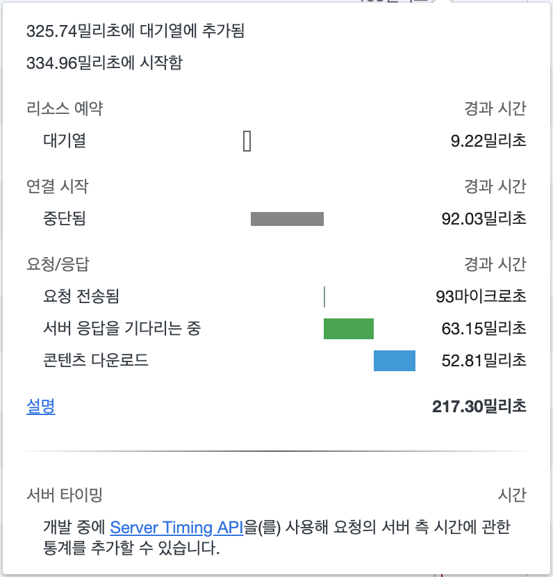 연결 시작(92.03) + 요청 전송됨(0.093) + 서버 응답을 기다리는 중(63.15) = 115 밀리초