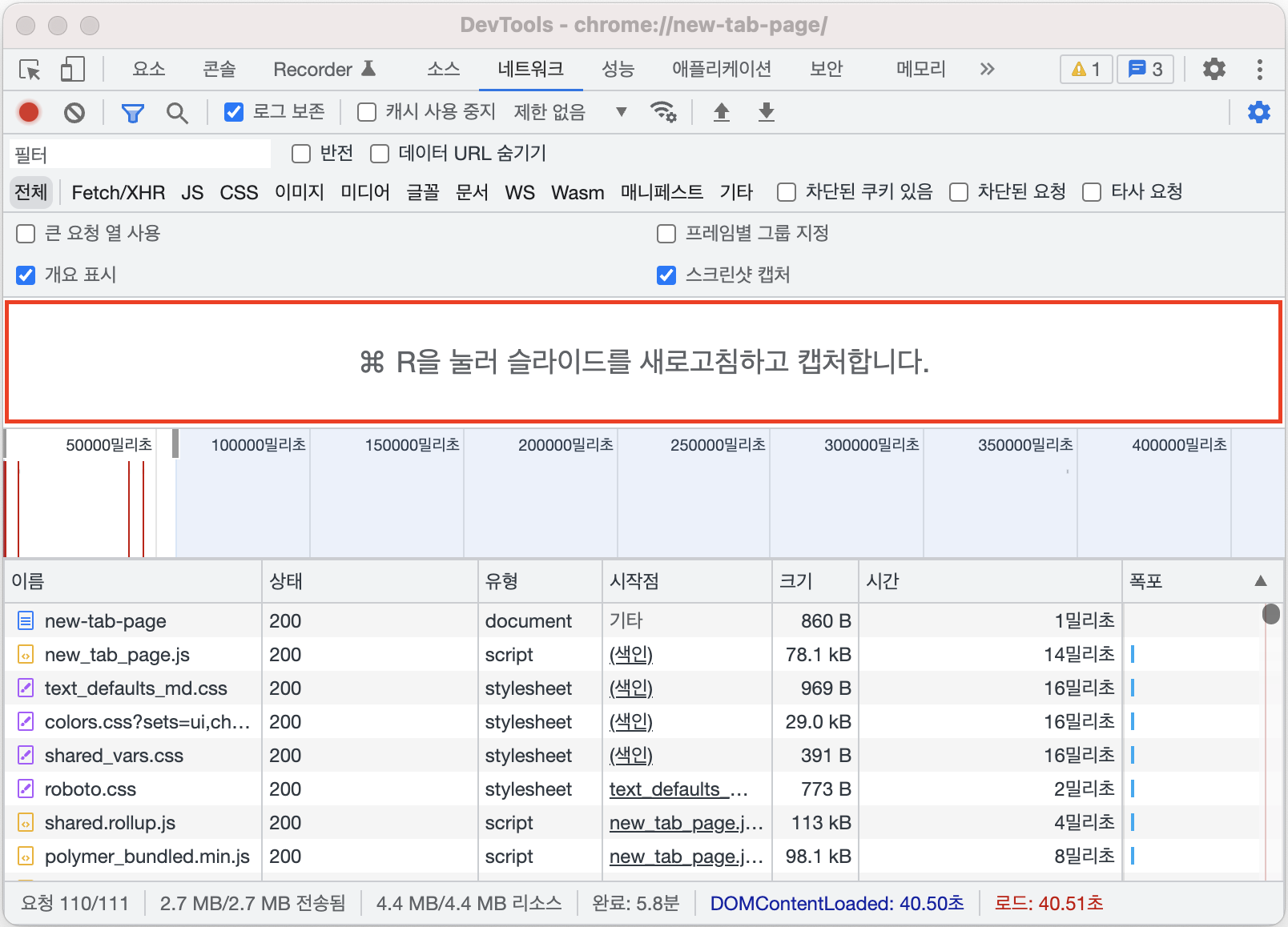 단축키를 누른 다음 웹 페이지를 새로고침 하면 페이지가 로딩되는 과정이 캡처됩니다.