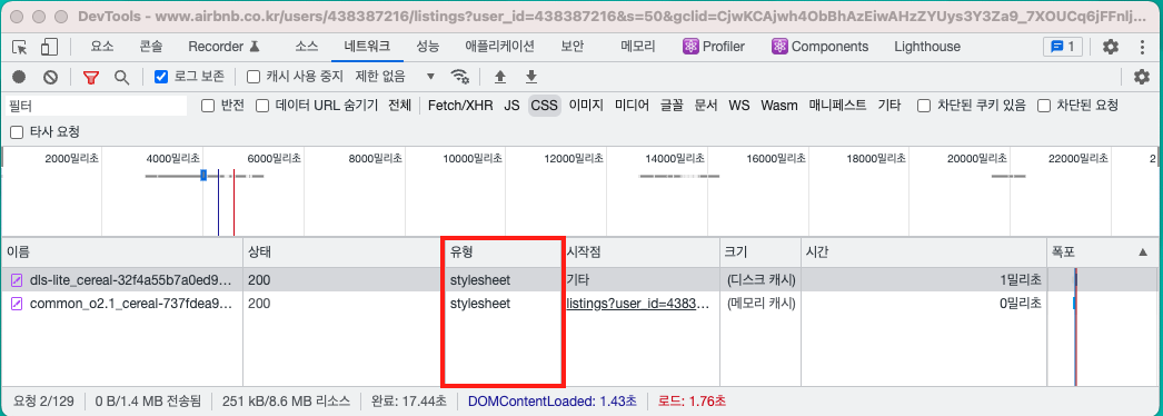 CSS 파일 요청을 필터링하고 싶은 경우 CSS를 선택합니다.
