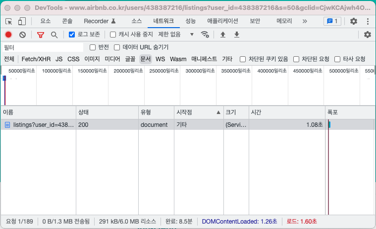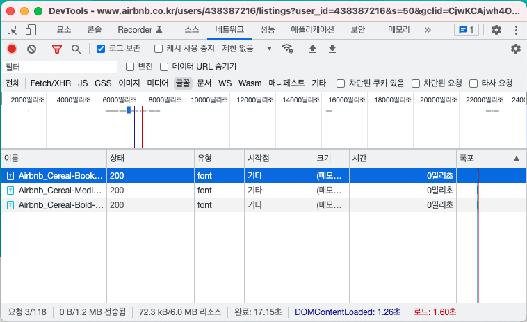 다음 예시는 에어비앤비(airbnb) 사이트 접속 후 에어비앤비 사이트 전용 웹 폰트를 요청하는 경우입니다.