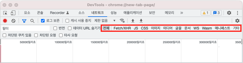 크롬 개발자 도구의 네트워크 탭에는 필터 기능이 존재하며 유형별로 요청(Request)을 필터링할 수 있습니다.