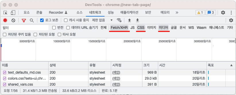 다음 스크린샷은 Fetch/XHR, CSS, 미디어 유형이 선택된 경우입니다.