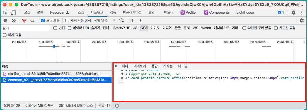 요청에 대한 응답을 보면 CSS 문법이 존재하는 것을 확인할 수 있습니다.