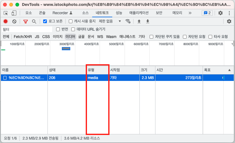 유형은 media로 표시하며, 미디어 플레이어가 존재하는 웹 페이지에서 동영상을 재생하면 미디어에 대한 요청이 발생합니다.