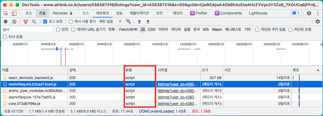 크롬 개발자 도구 네트워크 탭에서 유형별로 필터링